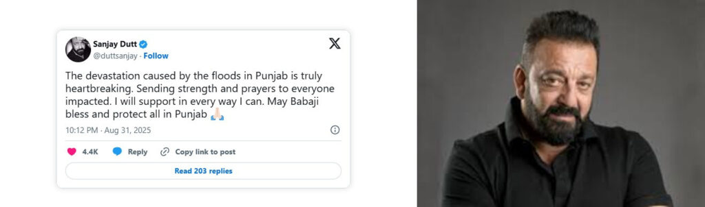 इसी स्थिति को देखते हुए संजय दत्त ने लिखा – “पंजाब में बाढ़ से हुई तबाही दिल दहला देने वाली है। प्रभावित लोगों के लिए शक्ति और प्रार्थनाएँ भेज रहा हूं। मैं हर संभव मदद करने के लिए तैयार हूं। बाबाजी सबकी रक्षा करें।”